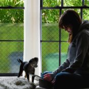 | This is our signature film, providing a gorgeous frosted glass appearance in addition to full privacy. It’s the only eco friendly pvc-free and phthalate-free choice on the market as far as we know! It applies to windows like butter and trims beautifully with household scissors. It can be installed anywhere the adhesive privacy film can and it has the same years-long staying power, despite being adhesive free. It can also be removed and reused. Our only film that has this advantage. We are happy to print this film in any size but our printers are not able to cut this film. If you need custom cut film you’ll have to move on to one of our other two films… | Providing just as pretty a frosted glass look as our pvc-free film, we are able to both print AND CUT this material to your window’s exact measurements, if you choose the custom option. The plastics in this film actually make it a bit more malleable allowing our machines to softly cut score lines into the material. To install the perfect pre-cut film all you need to do is lift it from the backing paper, spray with water, and apply—no scissors needed! And if you want the same beautiful light that our privacy films allow but want to maintain a bit of your inside and outside views then you want to consider our 3rd option… | This material blurs rather than obstructs views, ‘softening’ your line of sight. You can still enjoy the beauty of what’s outside and those outside can get an idea of what they’re seeing inside, but exact details remain blocked. This material is not pvc-free, therefore it can be both custom printed AND CUT to your exact measurements, if you choose the custom option. A very popular choice for more moderate privacy needs! |